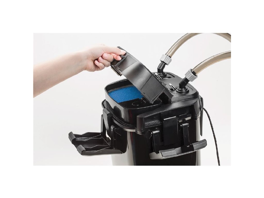 | Vestavěný předfiltr - První svého druhu Ve víku každého filtru ULTRAMAX je zabudován velký houbový předfiltr (o objemu cca 0,6 l). Je navržen tak, aby zachycoval běžné mechanické nečistoty dříve, než se dostanou dovnitř filtru. Tímto způsobem předfiltr chrání zařízení před zanesením, což snižuje potřebnou frekvenci čištění na minimum. Místo toho stačí houbičku předfiltru pravidelně omývat ve vodovodní vodě. To zabere jen několik minut a nevyžaduje to odpojení filtru od napájení ani jeho vyjmutí z akvarijního stojanu. |