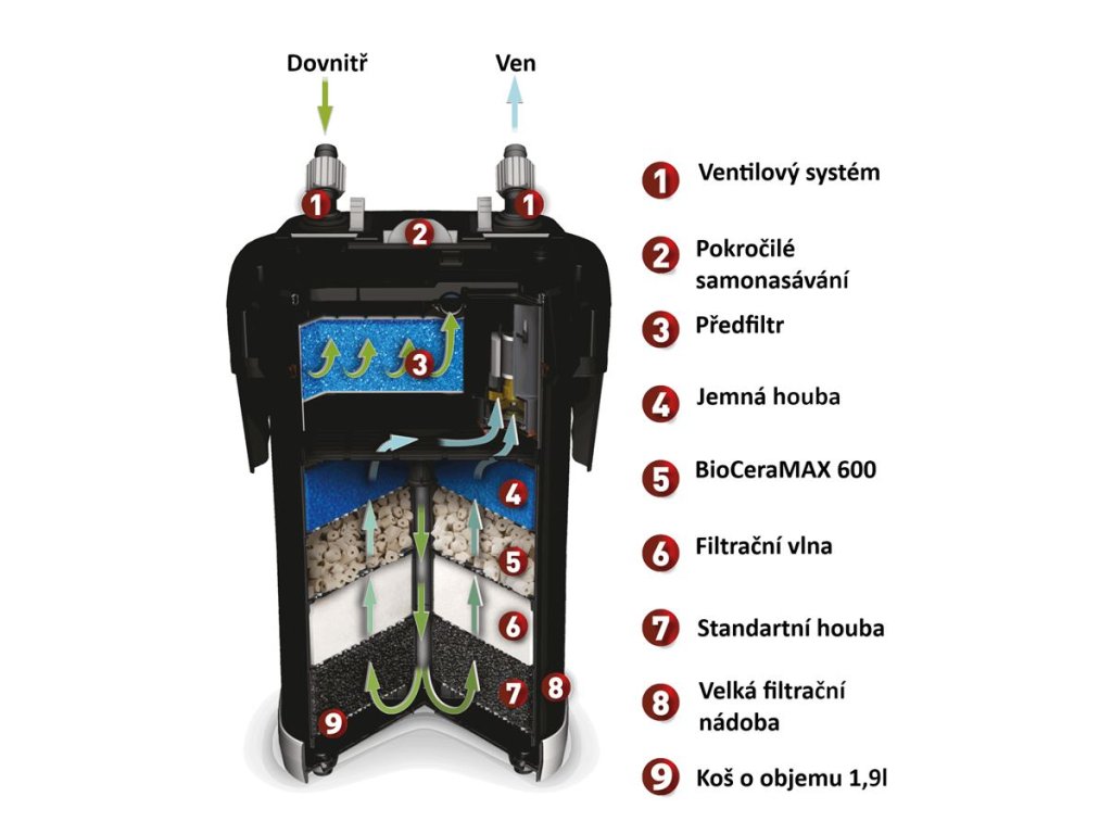 Filtry ULTRAMAX se mohou pochlubit vysokým průtokem vody a mohou efektivně pracovat i ve velmi velkých nádržích. Kromě toho jsou velmi prostorné, takže pojmou velké množství filtračních médií. Filtrační média jsou umístěna v praktických ergonomických koších, z nichž každý má objem 1,9 l. To zaručuje mimořádně účinnou mechanickou a biologickou filtraci. Filtry jsou dodávány s kompletní sadou filtračních médií pečlivě vybraných tak, aby vyhovovaly potřebám typického akvária.