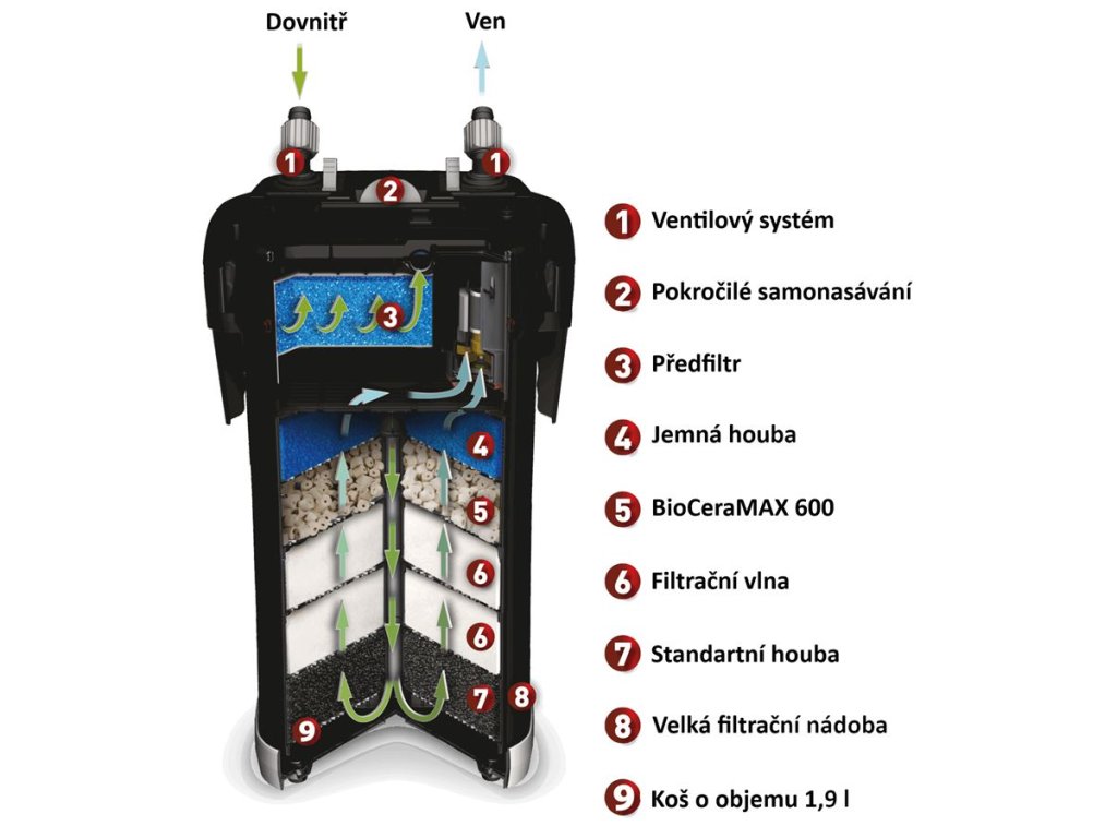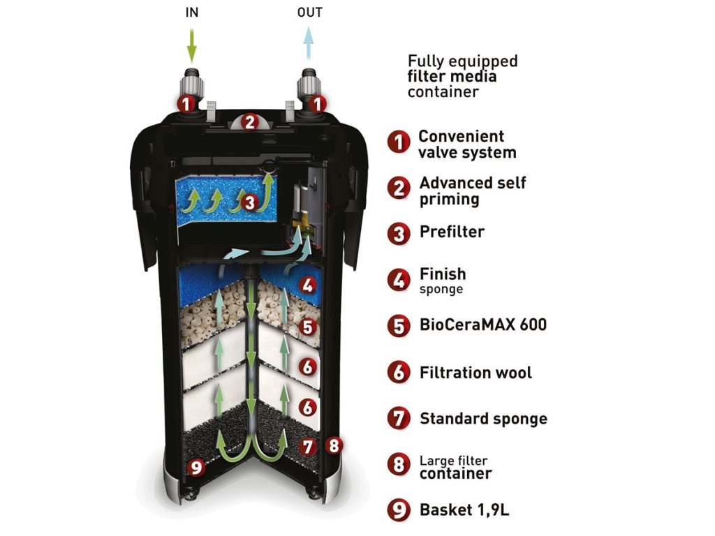 Filtry ULTRAMAX se mohou pochlubit vysokým průtokem vody a mohou efektivně pracovat i ve velmi velkých nádržích. Kromě toho jsou velmi prostorné, takže pojmou velké množství filtračních médií. Filtrační média jsou umístěna v praktických ergonomických koších, z nichž každý má objem 1,9 l. To zaručuje mimořádně účinnou mechanickou a biologickou filtraci. Filtry jsou dodávány s kompletní sadou filtračních médií pečlivě vybraných tak, aby vyhovovaly potřebám typického akvária.