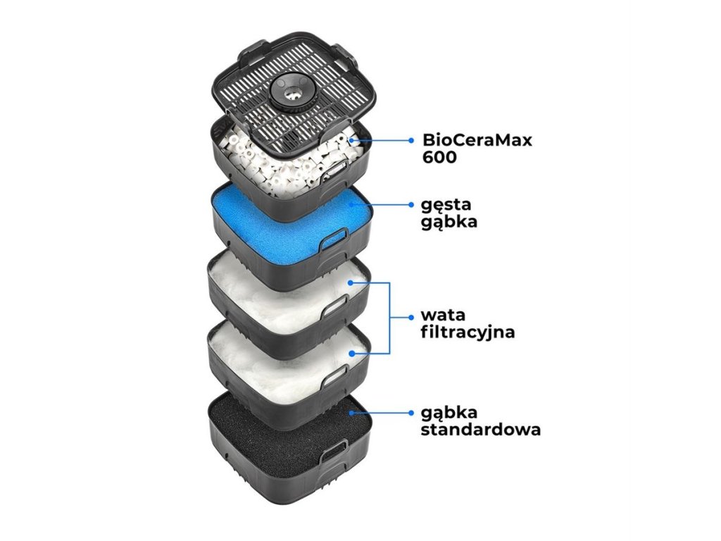 🛑 5 košů na filtrační média – celková kapacita až 10,1 litru! 🔄 Možnost flexibilního složení filtračních médií podle potřeb vašeho akvária.