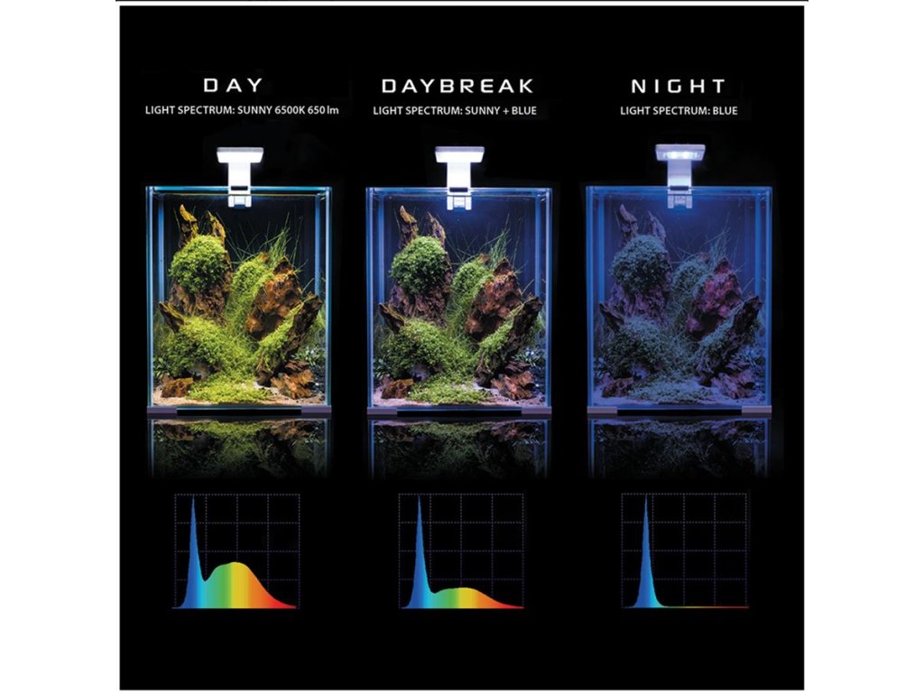 | LED OSVĚTLENÍ LEDDY SMART DAY&NIGHT Nejmodernější úsporné LED napomáha k zdrávému prostředí akvária a podporuje růst rostlin. Osvětlení má tři řežimy svícení - Den/Svítání/Noc. |