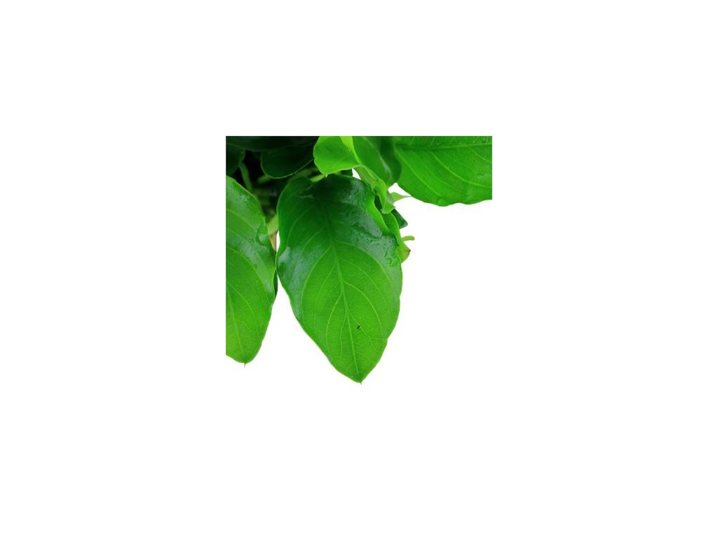 Živá vodní rostlina v košíkuAnubias nana 'Large' je kompaktní druh anubiasu velmi podobný rodu var. barteri nana. Jediný rozdíl j, že tento anubias má oněco větší listy. Tuto rostlinku byste nikdy neměli sázet do substrátu. Pokud byste tomu tak udělali a zakryli hlavní stonek, tak by rostlina postupně strádala a uhynula.
