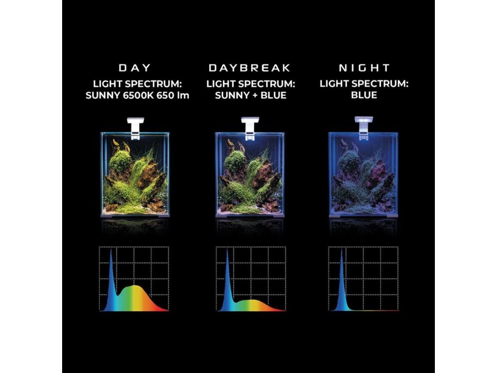 Leddy Smart Sunny Day & Night je LED lampa s minimalistickým designem pro malá akvária. Nyní s přidanou novou funkcí Day & Night. Vyberte si jeden ze tří světelných režimů podle svých potřeb a díky tomuto novému světlu bude na vaše akvárium nádherný pohled v kteroukoli denní dobu.Výhody LED lampy