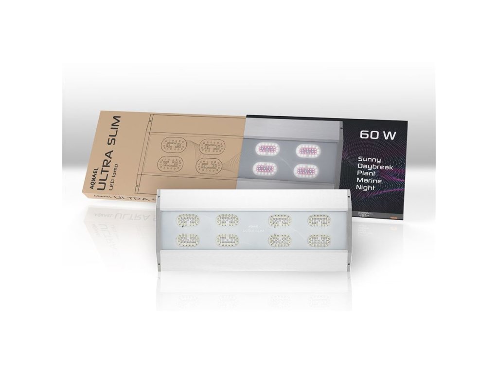Ideální pro náročná holandská akvária s rozmanitou vegetací, UltraSlim se snadno přizpůsobí rozměrům vašeho akvária. Pokud máte akvárium nestandardních rozměrů, pak by vás UltraSlim měl zaujmout o to více. Vybírat můžete ze 3 velikostních variant lampy s délkami: 30, 60 a 90 cm nebo si můžete vytvořit samostatný osvětlovací modul zavěšením lamp vedle sebe. UltraSlim má také 2 možnosti montáže: můžete ji zavěsit nad akvárium na ocelová lanka nebo ji připevnit k okrajům nádrže pomocí nastavitelného rámu vybaveného průhlednými vodítky. Úspora energie a bezpečnost V závislosti na velikosti má UltraSlim 4, 8 a 12 reflektorů, z nichž každý je vybaven 38 moderními LED diodami s vysokou účinností >103 lm/W. Diody vyzařují mnohem více světla než tradiční zářivky, přičemž spotřebovávají přibližně o 50 % méně elektrické energie. Faktorem, který dále přispívá k energetické účinnosti, stejně jako k bezporuchovému a tichému provozu svítidla, je použitý pasivní systém chlazení. Díky jeho konstrukci zářivka účinně odvádí přebytečné teplo a nepotřebuje další zdroje chlazení, jako jsou ventilátory. Stejně jako ostatní výrobky Aquael zaručuje UltraSlim vysoký standard bezpečnosti při používání. Lampa je napájena bezpečným provozním napětím 24 V, které nepředstavuje žádné nebezpečí pro lidský život a zdraví. UltraSlim zůstane v bezpečí i v případě krátkého ponoření do vody, což zaručuje vodotěsnost IPX7. Design svítidla Aquarist UltraSlim kromě vysokého světelného výkonu jistě upoutá pozornost svým moderním, minimalistickým designem. Pouzdro je vyrobeno z jediné desky z broušeného hliníku a má tloušťku pouhých 17 mm, díky čemuž je svítidlo opticky mimořádně lehké. Namontována nad nádrží vypadá UltraSlim, jako by nad ní levitovala, což dále zaměřuje pozornost pozorovatelů na uspořádání akvária. Dostupné světelné režimy kromě funkcí souvisejících výhradně s údržbou nádrže umožňují také vytvořit v místnosti požadovanou náladu. V souladu s přírodními rytmy Lampa UltraSlim je dalším výrobkem společnosti Aquael, který je navržen tak, aby pomáhal co nejlépe reprodukovat v prostředí akvária přirozené podmínky života. Díky režimům SUNNY DAY-BREAK a NIGHT je možné v akváriu obnovit téměř přirozený denní cyklus, který je důležitý pro správné fungování a vývoj živých organismů.