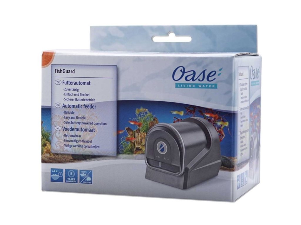 OASE FishGuard je spolehlivý automatický krmítko pro akvária a terária, které zvládne až 12 dávek krmiva denně. Díky sofistikovanému těsnění chrání krmivo před vlhkostí, a díky bateriovému provozu pracuje i při výpadku proudu. Vhodné pro sladkovodní i mořská akvária.
