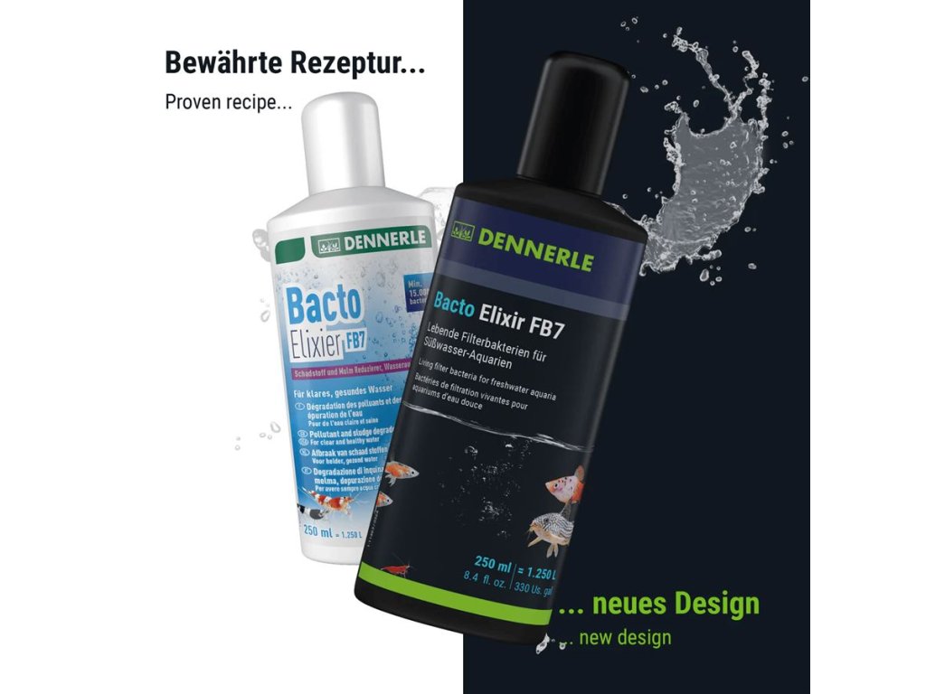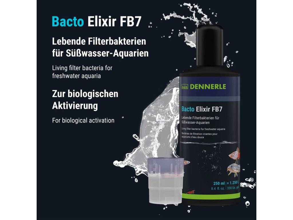 Bacto Elixier FB7 obsahuje více než 15 milionů aktivních bakterií na mililitr – a to hned při plnění do lahve. Po aplikaci se bakterie okamžitě aktivují a pomáhají odstraňovat nečistoty z vody, dna i filtrace. Výrazně zlepšují kvalitu vody, omezují tvorbu kalu a usnadňují údržbu nádrže.
