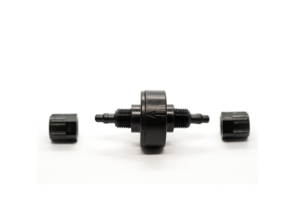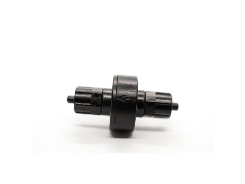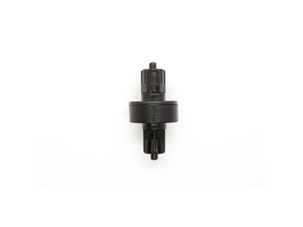 Oxid uhličitý je specifický plyn a má zcela jiné fyzikální vlastnosti než vzduch. Proto firma DENNERLE vyvinula speciální zpětný ventil pro CO2. Jeho "srdce" tvoří dlouhodobě elastická speciální membrána, která nepropouští CO2. Ta je napnutá mezi 2 těsněními. 2 fixační matice se postarají o tesnící spojení ventilu s hadičkami, skrz které neunikne žádný CO2.