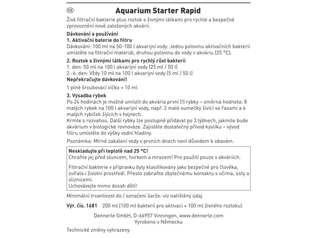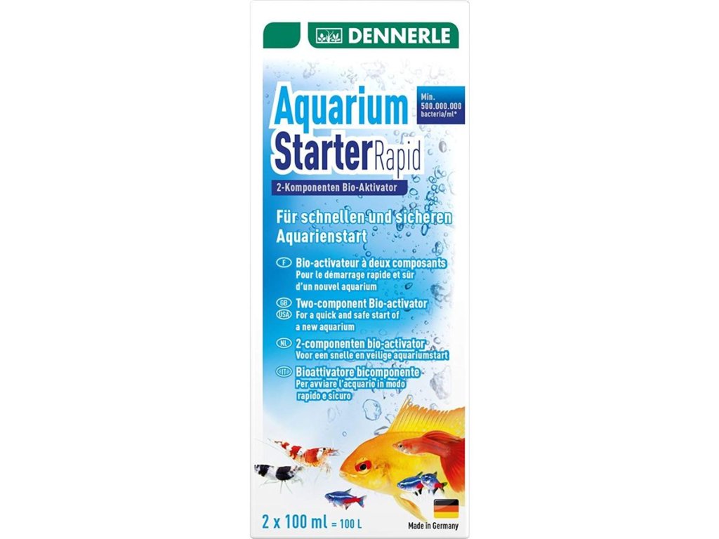 Dennerle Aquarium Starter Rapid je dvojbalení živých bakterií a výživného roztoku pro okamžité osídlení filtru a substrátu prospěšnými mikroorganismy. Zajistí biologickou rovnováhu už za 24 hodin – ideální pro nové nádrže.