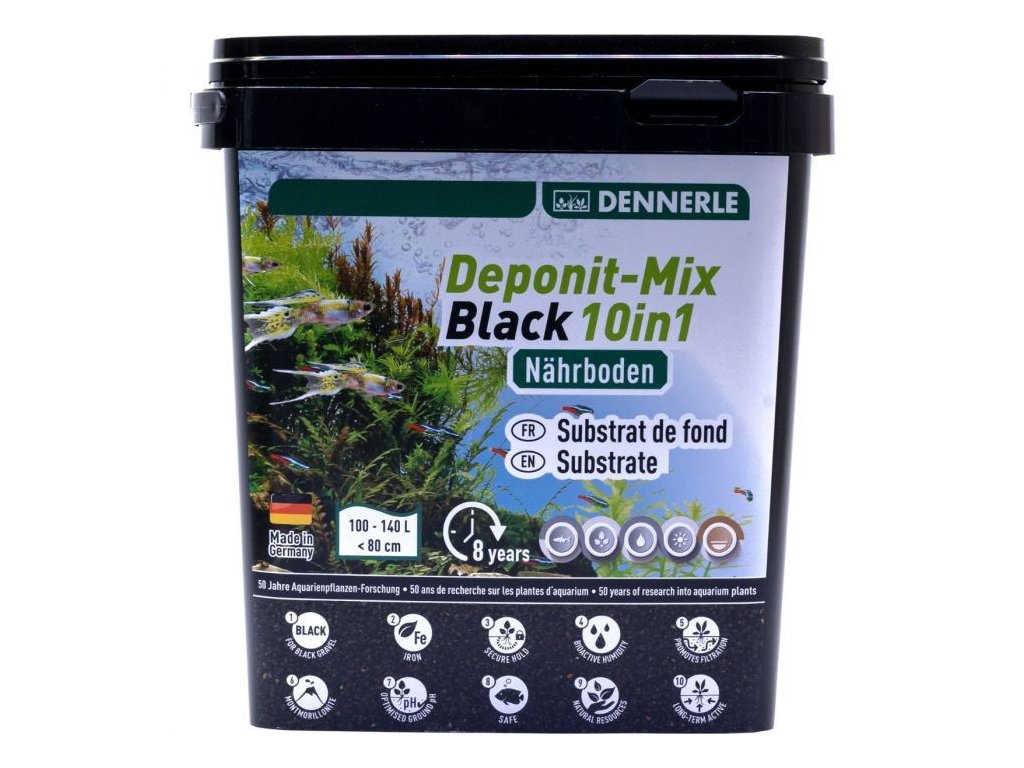 Veškeré živiny a stopové prvky jsou v depotní formě s okamžitou dlouhodobou účiností. Deponit-Mix Black zaručuje bezpečný růst a tvorbu silného kořenového systému a to i u náročnějších druhů rostlin. Výživné medium neobsahuje žádné přidané fosfáty a nitráty, tudíž nezpůsobuje entrofii vody a limituje růst řasy. Zemina je bezpečná a vhodná pro veškeré akvarijní živočichy, jako jsou ryby, krevetky, šneci a další. Růstová síla postavená na německém výzkumu a mnoholetých zkušeností společnosti Dennerle Vám zaručí bujný a zdařilý růst akvarijních rostlin.