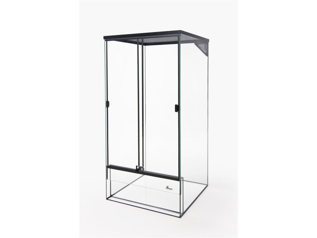 Toto vysoké skleněné terárium s praktickými posuvnými dveřmi, integrovaným zámkem a důmyslným systémem dvojité ventilace je navrženo speciálně pro druhy, které preferují prostor do výšky. Vrchní část tvoří perforovaný hliníkový rám s černou kovovou mřížkou, která umožňuje maximální odvětrání bez kompromisů na bezpečnosti. Díky černým detailům a silikonu působí terárium moderně a esteticky nenápadně – ideální volba pro náročné chovatele stromových žab, gekonů, anolisů nebo menších chameleonů.