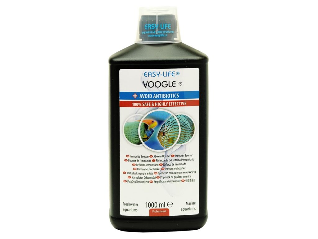 Easy-Life Voogle je inovativní a bezpečný přípravek, který podporuje přirozený imunitní systém ryb a napomáhá jejich hojení – bez použití antibiotik. Díky složení na bázi rostlinných extraktů, vitamínů a minerálů posiluje obranyschopnost, zlepšuje kondici a pomáhá rybám zvládat stresové situace, přepravu nebo karanténu. Je šetrný ke všem obyvatelům akvária, rostlinám i biofiltru a nemění parametry vody.