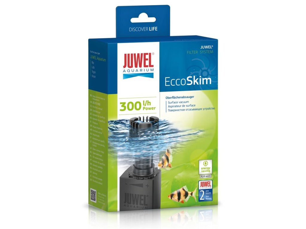 JUWEL EccoSkim je kompaktní a energeticky úsporný hladinový sběrač určený pro sladkovodní akvária. Díky plovoucímu nasávacímu mechanismu účinně odstraňuje bílý biofilm, mastnotu a organické zbytky z hladiny. Zajišťuje tak lepší přístup světla, vyšší obsah kyslíku a zdravější prostředí pro ryby i rostliny. Připojuje se přímo na vnitřní filtr JUWEL nebo pomocí přísavek i do běžných skleněných akvárií jiných značek.