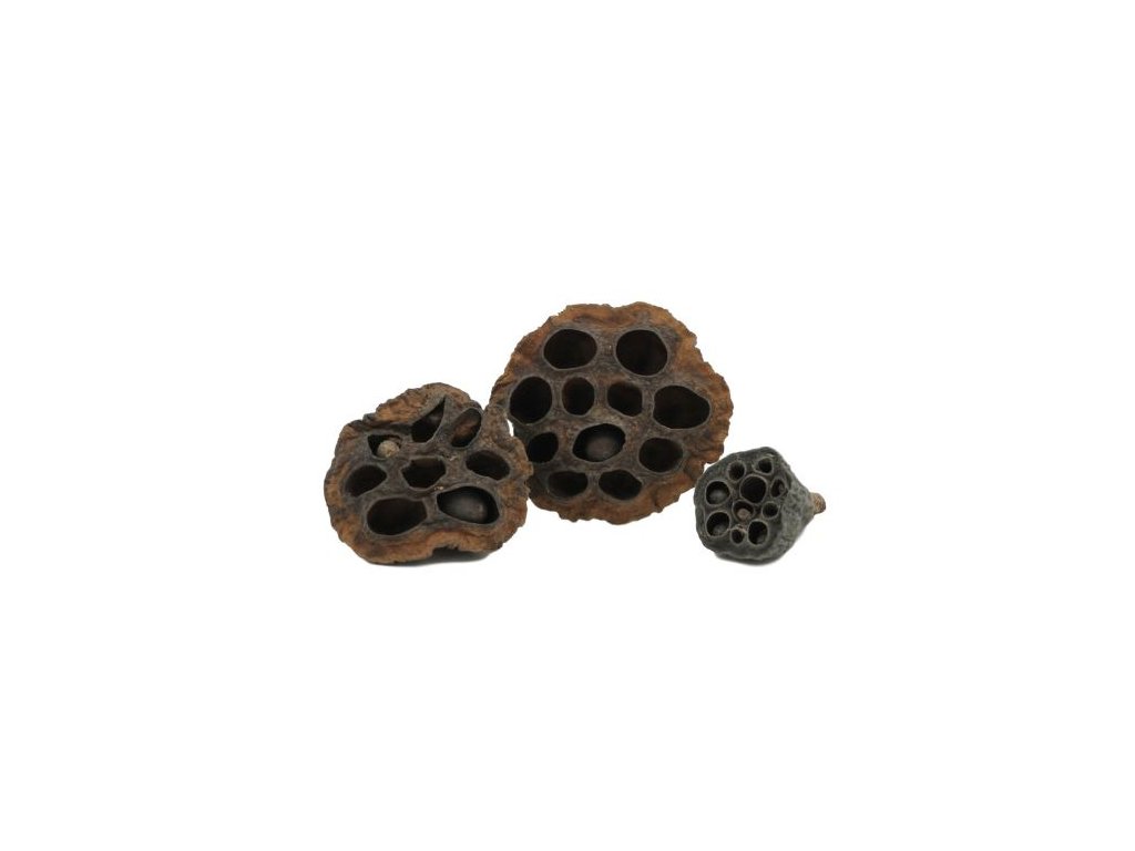Lotosové lusky (Nelumbo nucifera) jsou krásnou přírodní dekorací, která nejen dodá akváriu autentický vzhled, ale má i benefiční účinky na vodu a obyvatele nádrže. Díky malým otvorům poskytují krevetám a rybám úkryt i místo k hledání potravy. Lusky obsahují třísloviny, které mírně snižují pH vody, působí antibakteriálně, redukují stres a dodávají vodě přírodní hnědý odstín – ideální pro blackwater akvária.