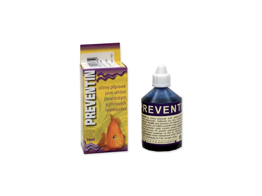 Preventin je účinný veterinární přípravek s obsahem methylenové modři, který napomáhá při ošetření akvarijních ryb při výskytu různých parazitárních a plísňových onemocnění. Je vhodný jako prevence při nákupu nových rybek, dezinfekci rostlin, zkrmování živé potravy nebo při vnějším poranění ryb. Při správném použití je bezpečný pro ryby i rostliny.