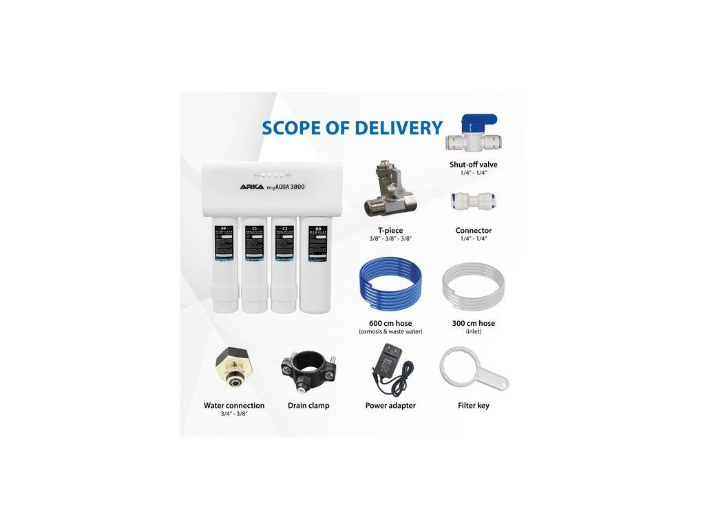 Hadička 300 cm (přívodní voda), 600 cm trubka (čistá voda a odpadní voda), T-kus 3/8 – 3/8 – 3/8 vč. ventil, montáž na stěnu, Elektrický zdroj na 24V, Vypouštěcí svorka, adaptér pro připojení vody 3/4 - 3/8, uzavírací ventil 1/4 - 1/4