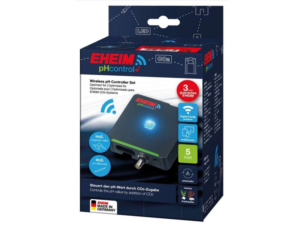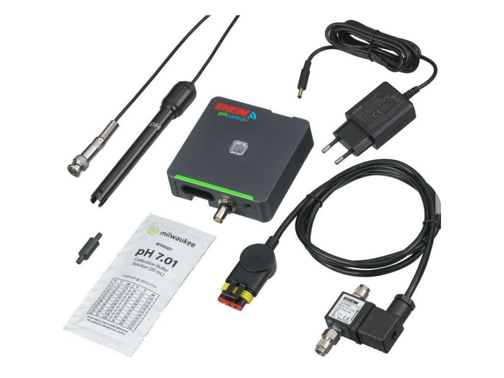 S EHEIM pHcontrol+e můžete snadno monitorovat a optimalizovat pH ve vašem akváriu pomocí chytrého telefonu nebo PC jednoduše přes WiFi připojení a váš webový prohlížeč. pH senzor měří aktuální hodnotu pH vody a pHcontrol+e automaticky zajišťuje potřebnou dodávku CO2. Ovládáním magnetického ventilu připojeného k systému CO2 se přidává tolik CO2, kolik je potřeba, dokud není dosaženo požadované hodnoty pH. Abyste toho dosáhli, musíte připojit svůj CO2 systém, tj. CO2 láhev přes redukční ventil, magnetický ventil a CO2 difuzér.