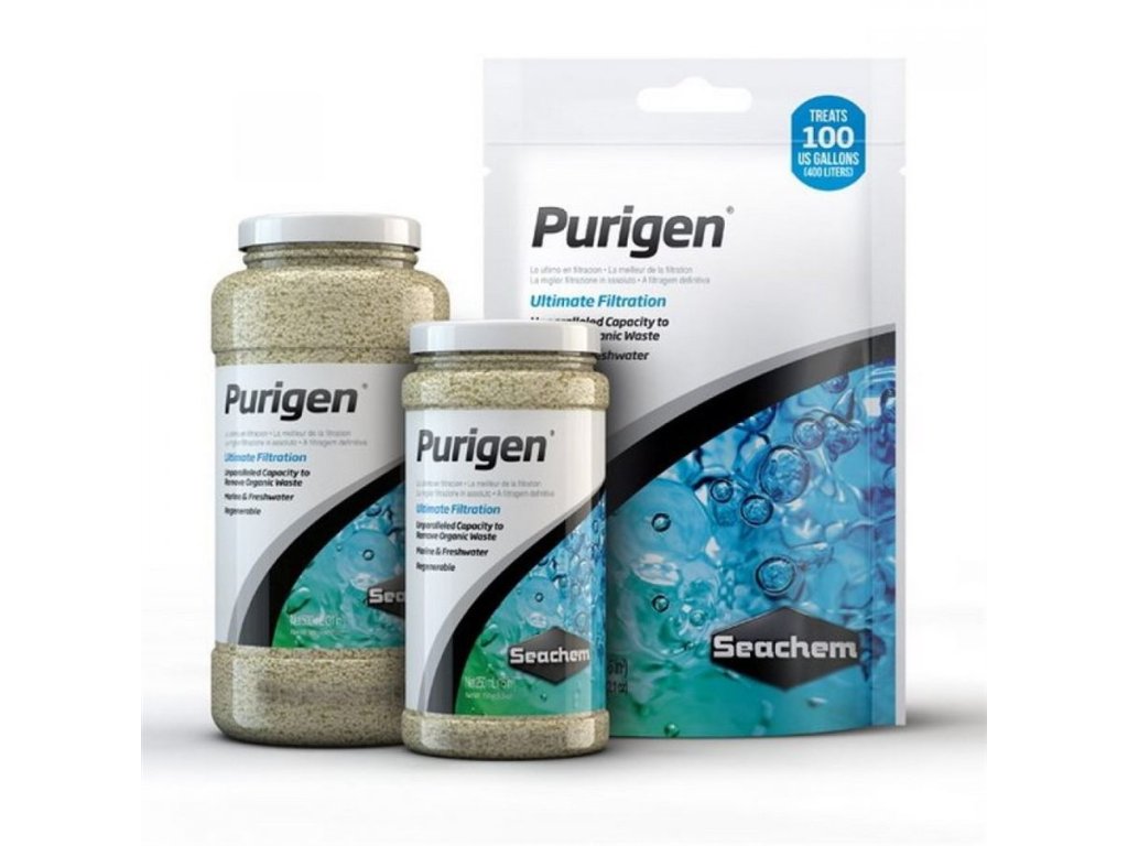 Purigen® odstraňuje rozpustné i nerozpustné organické nečistoty – rychle, účinně a bezpečně. Navíc snižuje hladiny amoniaku, dusitanů a dusičnanů tím, že eliminuje jejich dusíkatý původ. Během použití tmavne a jakmile ztmavne na tmavě hnědou/černou barvu, lze jej snadno regenerovat běžným bělidlem. Vhodný je pro sladkovodní i mořské akvárium, kde nahrazuje kombinaci aktivního uhlí, pryskyřic i jemných filtrů.