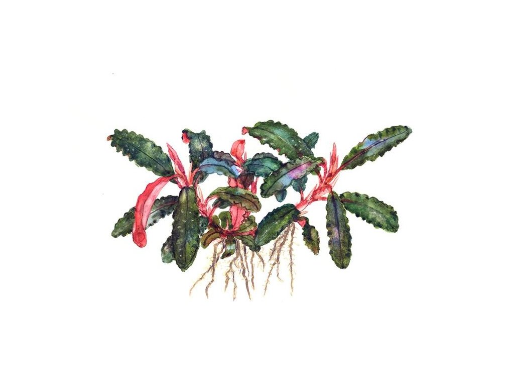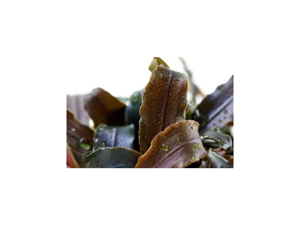 Bucephalandra s podlouhlými červenými stonky a tmavými listy