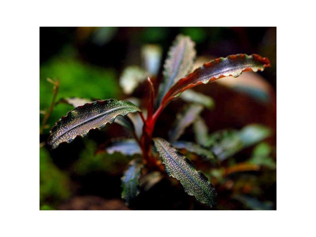 Bucephalandra s podlouhlými červenými stonky a tmavými listy