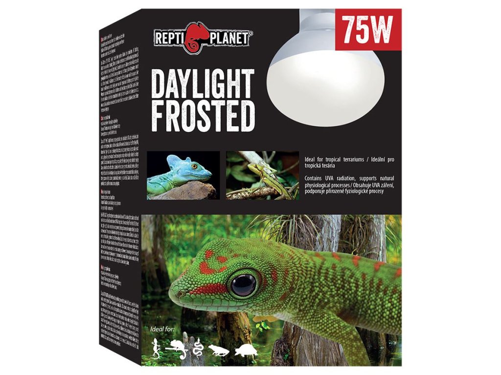 Žárovka REPTI PLANET Daylight Frosted poskytuje optimální poměr ultrafialového UVA záření, světelného záření a infračerveného (tepelného) záření a je ideální v kombinaci s UVB a nočními žárovkami (např. Repti Planet Repti UVB, Infrared Heat, Night Heat). Jedná se o širokospektrální žárovku, která podporuje fyziologické procesy jako je např. aktivita, příjem potravy a rozmnožování. Studené barevné spektrum imituje světlo v tropických oblastech a deštných pralesích. Žárovka je vhodná např. pro tropické žáby, gekony a ještěry.Hlavní přednosti: