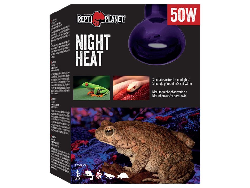 Žárovka Repti Planet Night Heat simuluje přírodní měsíční světlo a je ideální v kombinaci s denními výhřevnými žárovkami (např. Repti Planet Infrared Heat, Daylight Basking Spot, Daylight Frosted, Daylight Neodymium nebo Far Infrared Heat). Intenzita tepelného záření je nižší, což je ideální z důvodu přirozeného poklesu nočních teplot v přírodě. Zbarvení je dosaženo prostřednictvím modré barvy skla.